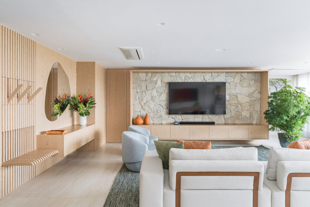 Apartamento 250m² no Brooklin com luz natural, marcenaria clara, travertino, chapelaria, adega e formas orgânicas em projeto sofisticado.